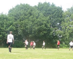 Ondanks de hitte begonnen beide ploegen aan een hoog tempo. De eerste kans was voor G.B. Een hoekschop belandde aan de tweede paal waar de volledig vrijstaande Bossie het leder maar binnen te duwen had. Hij was echter te verrast en liet de openingstreffer liggen. Daarna was het de beurt aan de thuisploeg. Na balverlies op het middenveld werd de G.B. defensie plots overlopen. Gelukkig kon Marnick nog net terugkeren en redde hij in extremis de meubelen. G.B. reageerde op zijn beurt meteen via Brecht wiens knal mooi gered werd door de thuisgoalie. Intussen waren we al tien minuten ver toen de scheids plots het idee kreeg de thuisploeg een handje te helpen. Een onschuldige verre bal belandde in de handen van Nick, Stef hield netjes de Moderne aanvaller af. Geen vuiltje aan de lucht ware het niet de man in het geel tot ieders verbazing plots naar de stip wees. Op de koop toe kreeg Stef ook nog een geel karton onder zijn neus geduwd. Strafschop wegens een ingebeelde fout, een primeur! De thuisploeg nam de assist dankbaar aan en knalde de elfmeter onhoudbaar tegen de netten. G.B. was op achtervolgen aangewezen maar reageerde meteen. Bossie dribbelde zich knap vrij maar werd foutief tegen de zode gewerkt. De scheids floot niet en gaf balvoordeel want het leder was bij Joris beland. Deze zette met een prachtig steekballetje Brecht alleen voor doel. Brecht op weg naar de 1-1. Toch niet. De fout op Bossie werd plots onbegrijpelijk alsnog gefloten en weg kans. Gelukkig bleven de spelers kalm en gingen ze op zoek naar de gelijkmaker. Bossie leek hier even later voor te zorgen maar zijn knal vanop 30 meter spatte uiteen op de dwarsligger. Even later kende hij nog eens pech toen zijn mooi plaatsballetje op de paal belandde. Ook Bait haalde knap uit maar vond de sterk keepende thuisgoalie op zijn weg. Net voor de pauze kwam de verdiende gelijkmaker uiteindelijk toch. Leroy trapte van net buiten de grote rechthoek op doel. De thuisgoalie kon alleen maar toekijken hoe het leder in zijn mandje belandde. Zo werd er met een 1-1 op het bord de rust ingegaan.