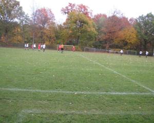 6 min. Vrije trap G.B. net voor de grote rechthoek. Bavo krult de bal netjes over de muur maar de thuisgoalie redt knap.