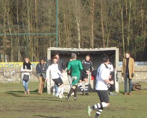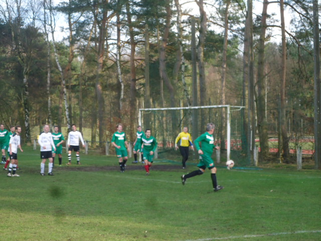 Bitter weinig te beleven het eerste wedstrijdgedeelte. De G.B. was duidelijk veel te sterk voor de thuisploeg maar speelde te slordig om de thuis defensie in de problemen te brengen. Pas op het kwartier eindelijk een eerste kans te noteren. Wel meteen een grote. De thuisgoalie kon immers een schot van Brecht niet klemmen, Seeger stond op de juiste plaats om binnen te tikken maar miste onbegrijpelijk. Daarna was het weer tien minuten niks. KWB bleef met 11 man voor hun grote rechthoek parkeren en G.B. miste inspiratie en precisie. In de dertigste minuut eindelijk kans nummer twee. Brecht stond na een corner van Lange op de juiste plaats om binnen te knikken maar miste op enkele millimeters doel. Niet getreurd echter want amper een minuut later was het wel raak. Een mislukte voorzet van Seeger waaide bijna in doel. De plaatselijke goalie kon dit nog net voorkomen door de bal tegen de lat te tikken. De goed gevolgde Pieter legde echter met het hoofd de 0-1 in het mandje. Eindelijk was de Hechtelse muur gesloopt. De G.B. wou de match nog voor de rust beslissen en drukte door. Meteen met succes, want amper twee minuten na de eerste treffer tekende Seeger op aangeven van Kristof de 0-2 aan. Ei zo na scoorde G.B. een minuut later zelfs een derde keer. De thuisgoalie had echter een prachtige redding in huis op een schot van lange.